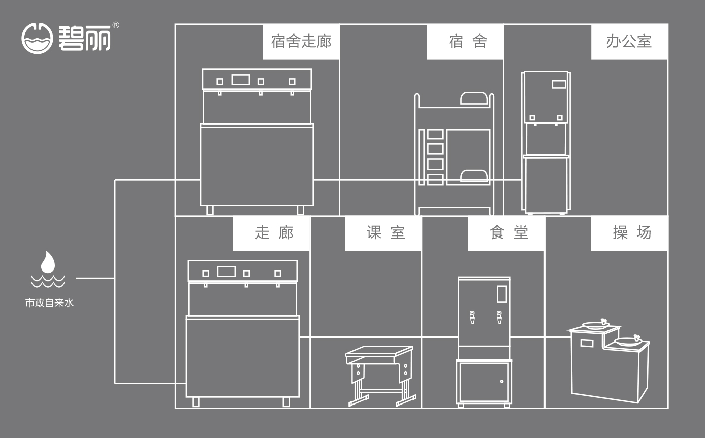 不同的飲水點可根據(jù)實際使用情況,安裝管線機或飲水設(shè)備或開水器,使用戶能喝上開水、溫開水、純凈水等,來滿足不同場景的飲水需求;